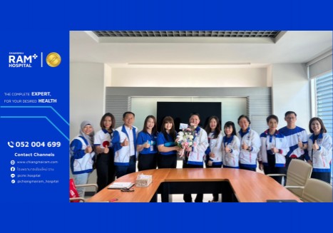 คุณกรรณิการ์ ชมภูเทศ ผู้จัดการแผนกลูกค้าสัมพันธ์ โรงพยาบาลเชียงใหม่ ราม นำทีมตัวแทนโรงพยาบาลฯ เข้าร่วมแสดงความยินดีกับ คุณฤทธิชัย แสงสุข...